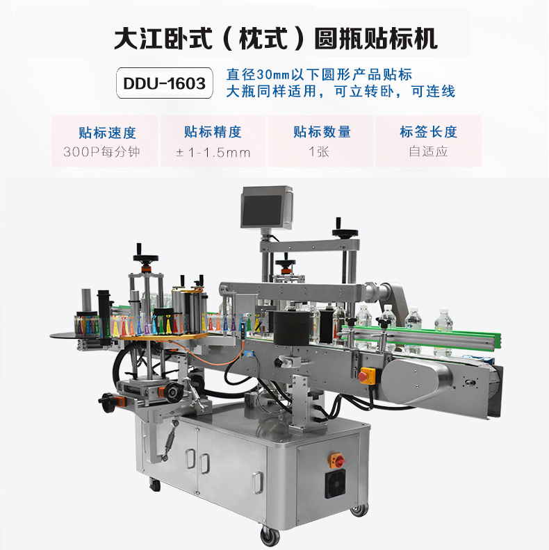 DDU-1603 立式圓瓶定位貼標機 適用范圍:用途廣泛!主要適用于醫(yī)藥、日化、食品等行業(yè)的圓柱形包裝容器或小錐度的圓錐形包裝容器的單標、雙標自動定位貼標.該機拓展性強!可選配各類打印機完成在線實時打印,可單機使用,亦能連接生產(chǎn)線使用 主要性能結(jié)構(gòu)特點:1、中英文觸…